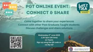 This event will aim to provide a space for PGT students who would like to come together with others to discuss their current challenges and share ideas and solutions with a focus on mental health and wellbeing as a PGT student. Please note, this is an interactive event and attendees are encouraged to be actively involved and engaged in conversation and discussion throughout. The event will be delivered to you and facilitated by a panel of wellbeing advisers from the University Of Edinburgh’s central Student Wellbeing Service.